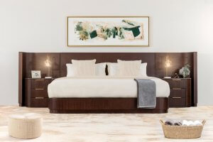 Innovación en recámaras: La Recámara Astor destaca por su tendencia de cabeceras extendidas, que crean un foco visual arquitectónico al abarcar gran parte de la pared.